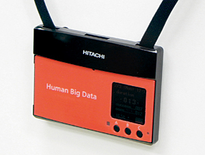 前号まで、ウェアラブル端末はアイデア次第でさまざまな用途に応用できることをレポートしてきた。今号でレポートする日立製作所が開発したウェアラブル端末は、加速度や赤外線、温度、湿度、照度などごくありふれたセンサを搭載した首掛け式のカード型ウェアラブル端末である(右上写真参照)。普通の“活動量計”程度の機能しか実装していないが、実はこの端末で“一定規模の集団の幸福感”を計測する日立独自のソフトウェア・アルゴリズムを開発した。
