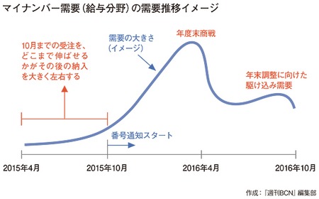 ガイドラインに沿った安全管理の措置を講じることができるシステム一式の納入、そして担当者の研修のことまで考慮に入れると、中小企業を多く抱えるベンダーであればあるほど「自らの顧客にすら対応できなくなる」(あるITベンダー幹部)と明かす。需要の大きな“波”は、マイナンバー通知が始まる今年10月から16年3月の年度末にかけての期間と、年末調整に向けた“駆け込み需要”の大きく二つがあると予測される。一度に集中するとマンパワーが不足して対応できなくなるので、この4月から10月までの「半年間にどれだけ前倒しで受注・納品できるかが勝負」(キヤノンS&Sの市村係長)と、1社でも多くの顧客の受注をこなすために商談の前倒しが不可欠だと気を引き締めている。(つづく)(安藤章司)