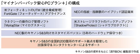 キヤノンシステムアンドサポート(キヤノンS&S)は、税別101万7800円でマイナンバー対応が可能な「マイナンバーパック安心PCプラン+」を業界に先駆けて中小企業向けパッケージを投入。NECの指紋と指静脈のハイブリッドでログインするスキャナや、同じくNEC製のキヤノンS&S向けカスタマイズパソコン(5年のハードウェア保守つき)、米フォーティネットのUTM(統合脅威管理)FortiGateアプライアンス製品、ラネクシーの操作ログ管理ソフト「MylogStar(マイログスター)」、米ストレージクラフトのバックアップソフト「ShadowProtect(シャドウプロテクト)」などをパッケージ化した。