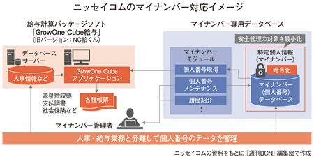 なかでもユーザーに高く評価されたのは、マイナンバーを格納するデータベース(DB)を、「GrowOne Cube給与(旧NC給くん)」のアプリケーションソフトとは別にした点(図参照)。マイナンバーを保管するデータベースは特定個人情報に該当するため、国の定めたガイドラインに沿って安全に管理しなければならず、罰則規定もあるやっかいなシロモノだ。
