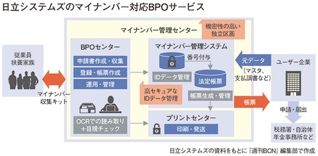日立製作所グループのマイナンバー(社会保障・税番号)制度への対応支援サービスは、日立製作所とその傘下の主要SIerである日立システムズ、日立ソリューションズの主に3社で取り組んでいる。日立システムズは強みとするセンター業務を応用して、主にBPO(ビジネスプロセス・アウトソーシング)方式で臨み、日立ソリューションズはユーザー自身がマイナンバーを管理することを念頭に、各種の情報セキュリティや管理システムを提供する方式を採用している。
