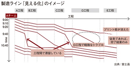 富士通は、グループ内で実際にIoTのPoBが進んでいる事例として、通信機器を製造している富士通アイ・ネットワークシステムズ山梨工場での取り組みを公表している。製造の現場でのIoT活用だが、大澤シニアディレクターは、「単純に工場をオートメーション化して品質や生産性の向上につなげようということではない」と強調する。「この事例も、全社方針の“ヒューマンセントリック”が基本にある。働く人の意欲の向上や働きやすい環境を実現し、結果として品質、生産性の向上につなげていきたいというのがコンセプト。あくまでも働く人に起点を置いたビジネスの変革を目指している」。