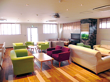 本社オフィスのリフレッシュルーム。広々としたスペースに大きなソファー、暖色系の内装。社員同士がくつろぎながら交流できるよう気配りしてあるユーザーと目標を共有して前進