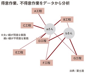 大澤達蔵・ネットワークサービス事業本部IoTビジネス推進室シニアディレクターは、「人の動きを生産ラインのプロセスの一部としてデータ化できるのは、富士通のヒューマンセントリックなセンシング技術ならではの非常に大きなポイント」だと説明する。「簡単にいうと、誰がどの作業・工程を得意としているのか、不得意としているのかとか、どの作業にストレスを感じるか、または快適にこなすことができるのかなどを、データをもとに推測できる。さらには、人と人の組み合わせの相性によってチームの効率性が上がったり下がったりという相関関係もデータとして出てくるだろう。これらのデータを複合的に分析・活用してタレントマネジメントソリューションに落とし込み、代表的なSoRの一つである人事管理システムと連動させたりという可能性を模索している」。