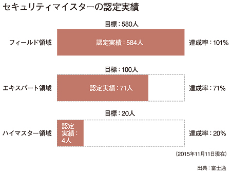 センター長 前号で、富士通は2016年度中に、フィールド領域580人、エキスパート領域100人、ハイマスター領域20人のセキュリティマイスターを認定するという目標を掲げていることを説明した。15年11月11日現在、フィールド領域は584人の認定実績があり、すでに目標を前倒しで達成している。一方で、エキスパート領域は71人、ハイマスター領域は4人と、高度なセキュリティ人材ほど、まだ認定実績が少なく、育成が遅れている傾向があるといえそうだ。