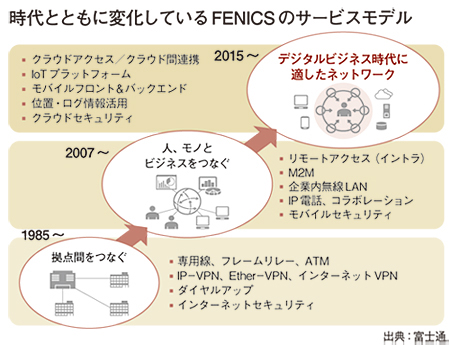 富士通が提供するネットワークサービスのブランド「FENICS(フェニックス)」が、昨年、30周年を迎えた。のべ5000社を超えるユーザーにサービスを提供しており、これだけの長期間、同一ブランドで展開してきた商材は、ICTの世界では珍しい。1985年、国有事業だった通信事業が民営化された(通信自由化)ことをきっかけに、富士通も電気通信事業に参入し、VANサービスを開始した。