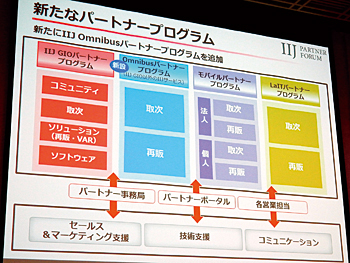 これまでIIJでは、IaaS型クラウドの「GIO」、モバイル通信、「LaIT」(中小企業向けサービス)などのサービスごとに独立したパートナープログラムを運営しており、パートナーに対する支援体制や窓口が統一されていなかった。今後は、プログラム全体の名称を「IIJパートナープログラム」にあらため、サービスのカテゴリを問わず、パートナーのIIJビジネス全体を支援する窓口やポータルサイトなどを整備していく。