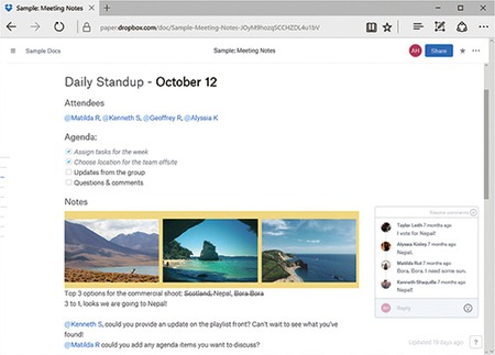 Dropboxでは今後、コラボレーションを促進し企業の生産性を高めるプラットフォームとなる方向でサービスの拡充を図っていく。昨年10月からベータ版の試験サービスを提供している「Paper」もその一つだ。Paperはウェブブラウザを通じて、クラウド上の文書を複数のユーザーで同時に編集可能なサービスで、文書には画像や動画、他の文書ファイルなどを貼り付けることができる。コメントや履歴管理、変更をメールで通知する機能もある。ドロップボックス・ジャパンの河村浩明社長は、「メールの添付ファイルで文書をやりとりするワークスタイルを、クラウドベースに変えようという提案だ。Dropboxは単にファイルの置き場所となるだけでなく、保存したデータを活用する機能を加えていく」と説明。最近は、社内ITインフラの運用に人的コストをかけたくないという企業が、ファイルサーバーをDropboxに置き換えることを検討する動きもあるといい、Dropboxは“便利なツール”から“業務のインフラ”へと姿を変えようとしている。