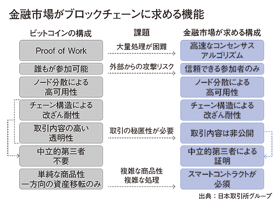 実証実験ではまず、金融市場で求められる機能とビットコインのブロックチェーンを比較し、課題を抽出(図参照)。これを踏まえて実証実験で採用する規格を決めた。次号では、その詳細をみていく。