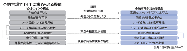 日本取引所が行った二つの実証実験では、ビットコインのように誰もがネットワークに参加できるパブリック型のDLTではなく、複数企業・組織の許可されたノードのみがネットワークに参加できる「コンソーシアム型」のDLTを採用した。これは、DLTに求められる機能が、金融市場とビットコインなどの既存の仮想通貨では異なるからだ。