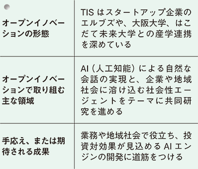 AI(人工知能)を巡る今回の一連のオープンイノベーションは、実はTISにとっても異例の取り組みだった。今年7月に大阪大学、8月にはこだて未来大学と矢継ぎ早に共同研究を発表。さらにスタートアップ企業のエルブズも巻き込んだオープンイノベーション方式を全面的に採り入れたのは、「今回が実質的に初めての取り組み」(油谷実紀・フェロー戦略技術センター長兼AI技術推進室長)。産学連携そのものは、過去にも経験があるものの、これだけのスピード感をもって協業の枠組みを構築したのは例がないという。(