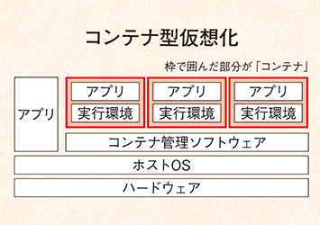 コンテナ型仮想化は、ソフトウェアがOSの上位につくりだした「コンテナ」と呼ばれる区画で、アプリケーションを動かせるのが特徴。いくつかある仮想化の方法のなかで、広い意味では「OS仮想化」に分類されることもある。