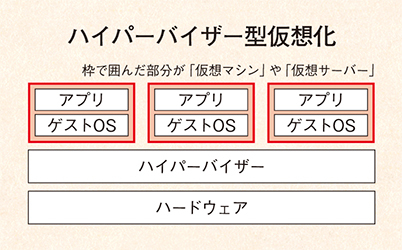 ソフトウェア「ハイパーバイザー」(hypervisor)を使って仮想化することを指す。サーバーを仮想化する方法のなかでは、最近の主流となっているといえる。