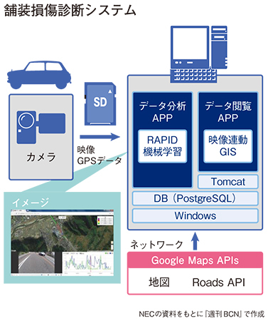 同様に、カメラで撮影した画像をRAPID機械学習が分析し、業務の効率化に貢献している事例がある。それがNECと福田道路(新潟市、河江芳久社長)が共同で開発した「舗装損傷診断システム」だ。路面の映像をRAPID機械学習を使って分析することで、わだち掘れとひび割れを検出し、道路の状態を把握する。