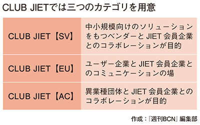 近年は国内の好景気を反映し、システム開発案件が過多の状態が続いており、会員からは案件紹介よりも人材紹介を望む声が多い。とはいえ、この追い風状態がいつまでも続くとは限らない。風向きが変化する前に、次の一手を打っておく必要がある。交流委員会では、こうした市況の変化や、IoTやAI(人工知能)といったトレンドに対応するために、外部との交流の活性化を目的として、CLUB JIETを運営している。現在は、大手ソリューションベンダーが対象の「CLUB JIET【SV】」、ユーザー企業が対象の「CLUB JIET【EU】」、異種業界団体が対象の「CLUB JIET【AC】」(アソシエーション)の三つをCLUB JIETのカテゴリとして用意している。