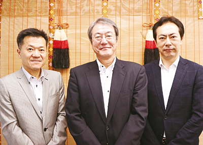 左から原田篤取締役、加賀谷龍一社長、片桐博文執行役員