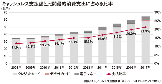 スマートフォンの開発・製造で世界をリードする米中では、世界に先駆けてスマートフォン決済サービスが立ち上がった。国内ではそうしたスマートフォン決済の基盤となるようなサービスが育っておらず、手をこまねいていては決済基盤が外資に牛耳られてしまう危機感が背景にある。過去の日本のキャッシュレスはクレジットカードが主流で、近年ではJR東日本のSuicaなど交通系ICカードの利用割合が増えている。全体で見ると、2017年時点で21.3%のキャッシュレス比率だった(図参照)。