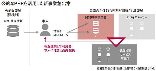 また、「人生100年時代」と言われるなか、現役を引退した高齢者の健康医療はより重要度が増す。そこで、図で示したような国や自治体が高齢者の定期健康診断などで得た情報を本人の同意とコントロールのもとで、PHR事業者やデバイスメーカー、健康増進サービスといった民間事業者と共有し、より密度の高い情報ネットワークの構築も検討されている。(つづく)