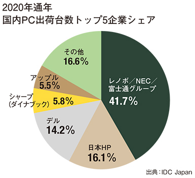 IDC Japanによると、20年の企業別の出荷台数シェアは、レノボ/NEC/富士通グループがトップで41.7%を獲得、前年から1.4ポイント拡大した。わずかな上昇のように見えるが、実はその中身が大きく変わっている。