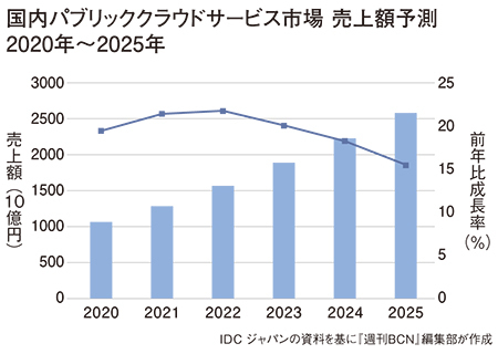 新型コロナ禍がクラウド市場の拡大を後押しする結果となったのは、もはや疑いようがない。調査会社のIDCジャパンは今年3月、2020年の国内パブリッククラウドサービス市場規模が前年比19.5%増の1兆654億円になったと発表。合わせて、20年から25年の同市場の年間平均成長率が19.4%で推移し、25年の市場規模は20年比2.4倍の2兆5866億円になるという予測結果も明らかにした。