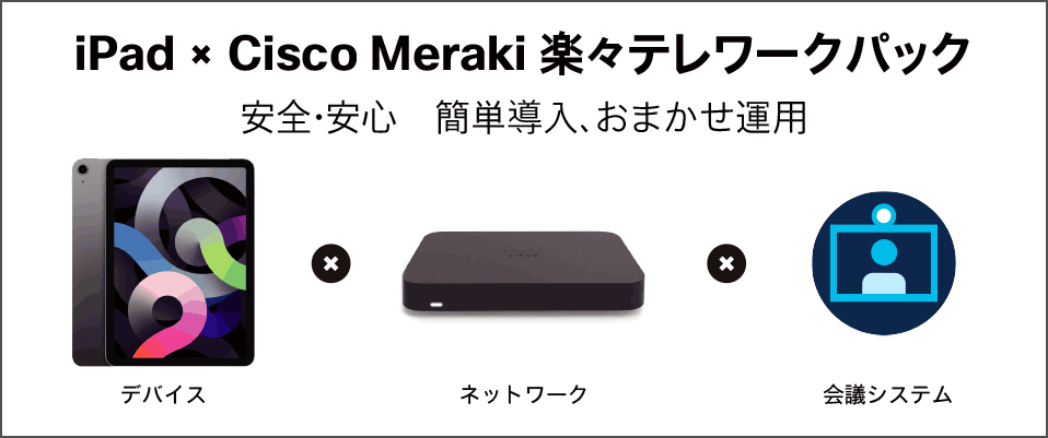 iPad x Cisco Meraki楽々テレワークパッケージは、テレワークの実施に必要なデバイス、Web会議システム、社員の自宅とオフィスを接続するネットワーク、またこれらの導入と運用サービスをまとめたパッケージ。事業継続計画のために安定的で安全なテレワーク環境の構築が急務となるSMB(中堅・中小企業)の顧客に向けて提供する。